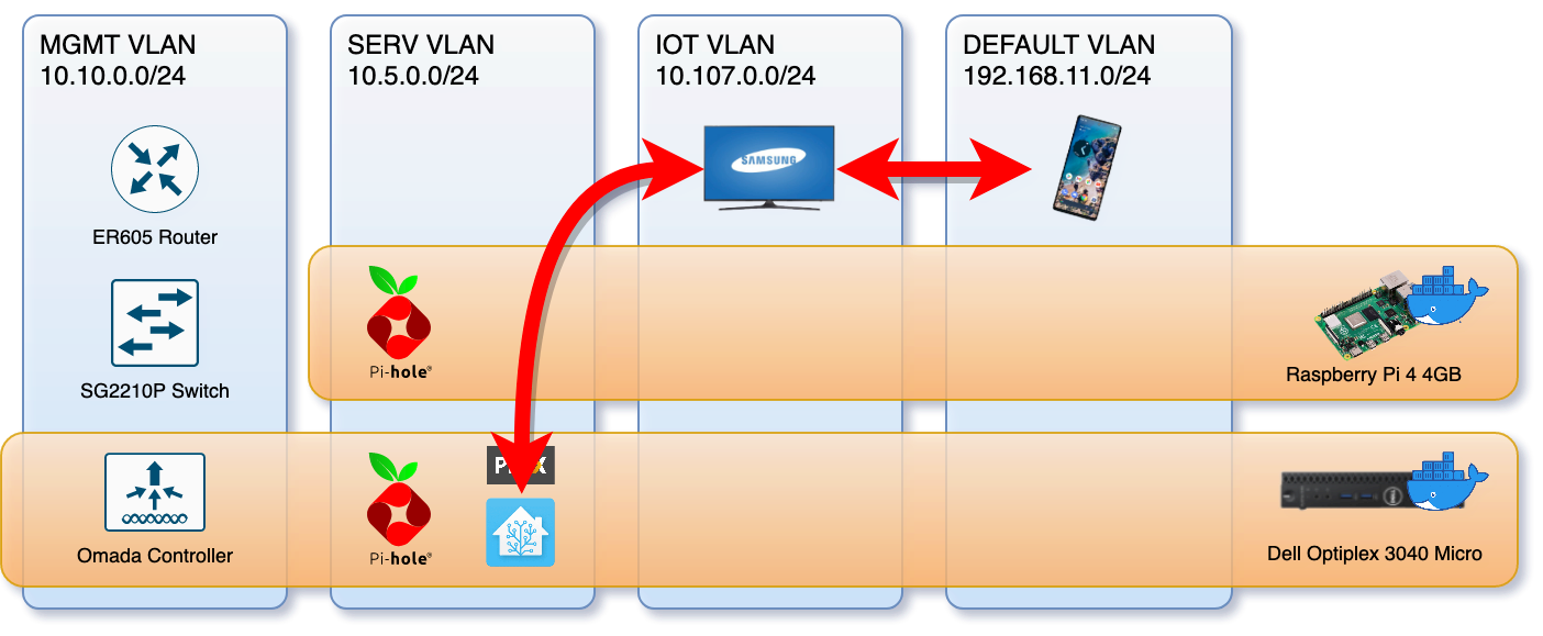 Samsung Smart TVs running Tizen OS like mine deny connections to their control websocket from source IP addresses that are not on the TV’s subnet. This, in theory, is a pretty straight forward security feature. Except you can’t turn it off and when you’re using VLANs the TV becomes impossible to control remotely.