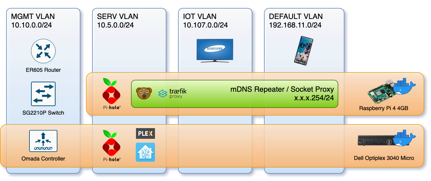 Owlcall went on to detail an Nginx configuration that acts as an in-subnet proxy service Home Assistant can use to access the TV. This was great and exactly what I needed, except I’d rather use Traefik Proxy for this sort of thing and since I was already running an Avahi mDNS reflector4 container in a way that spanned multiple VLANs I had an easy way to configure things for my network.